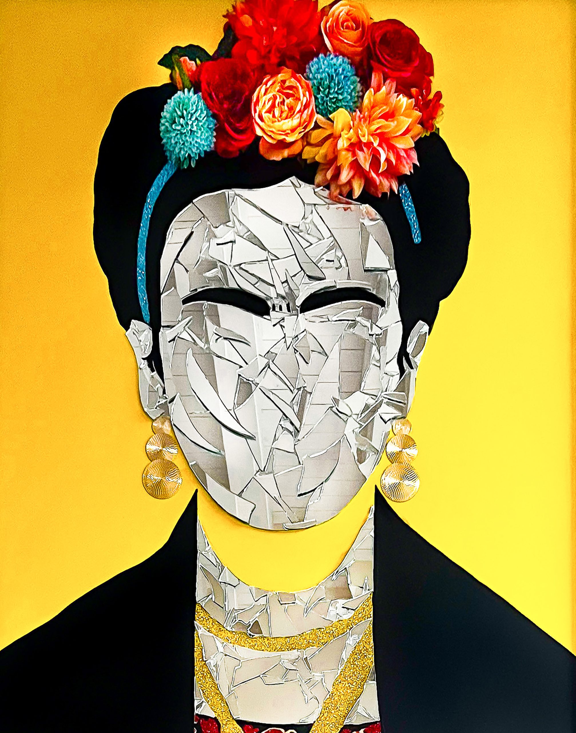 TECNICA: ACRILICO SU PANNELLO, MOSAICO DI SPECCHI, GLITTER, COLLAGE IN 3D E CORNICE SPECCHIATA